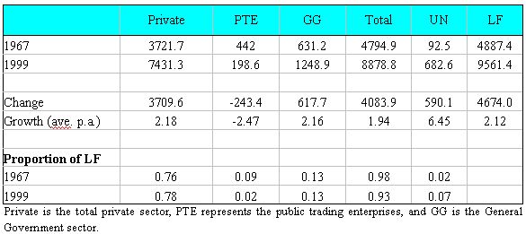 According the Australian Bureau of Statistics data, private business employment grew by 2.18 per cent per annum between June 1967 and September 1999. In the same time, the civilian labour force grew by 2.12 per cent per annum. The result is that the ratio of private employment to the labour force (the private employment rate) fell from 78.5 per cent to 77.1 per cent. Overall government employment over the same period has failed to keep pace with the rising labour force. Following the mass privatisations since 1990, employment in public enterprises has plummeted from to 442 thousand to 198.6 thousand (a large part of that is privatised employment). So the private business figures include jobs that were formerly in the private sector. However, the growth in private employment has not been sufficient to offset the public sector losses. Over the period, General Government employment went from 631.2 thousand to 1248.9 thousand, roughly proportional with labour force growth. Unemployment rose from 92.5 thousand (1.93 per cent) to 682.6 thousand (7.2 per cent).